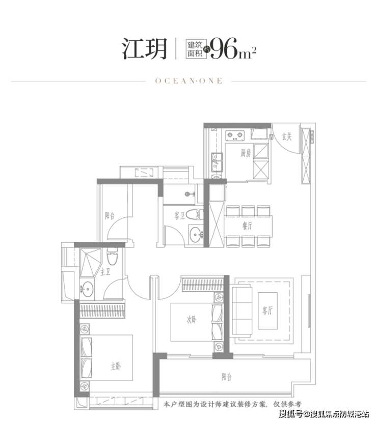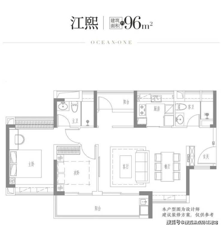 96㎡三房:竖厅布局,三开间朝南,6.4米景观阳台,南北通透;