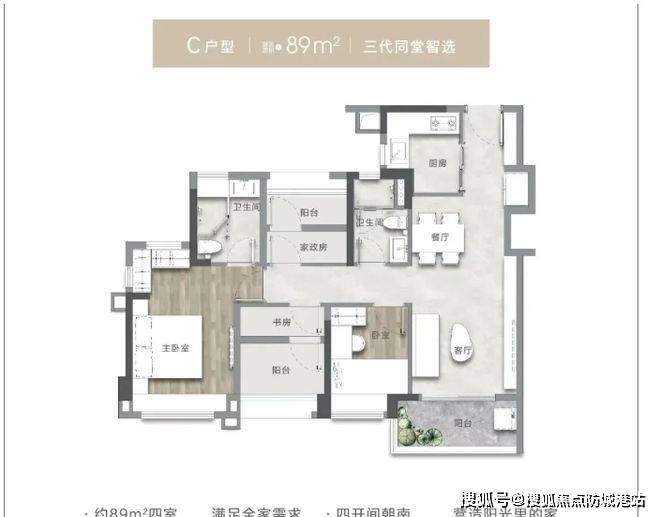 项目的户型设计注重实用性与舒适性的结合,得房率高达 95%,在同等建筑面积的情况下,相比其他楼盘多出两个空间,为居民提供了更为宽敞的居住体验。部分户型设计充分考虑家庭结构的多样性,例如 89㎡四房户型,合理的空间布局能够满足三代同堂家庭的居住需求。每个房间的尺度适宜,功能分区明确,动静分离,确保家庭成员的生活互不干扰,同时又能在公共空间享受温馨的家庭时光。这种实用的户型设计,既满足了当下家庭对居住空间的需求,又具有一定的前瞻性,适应家庭结构的变化,为居民打造舒适、便捷的居住环境。