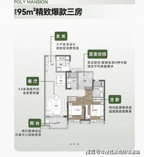 95㎡三房:全南向布局,明厨明卫,适合刚需;