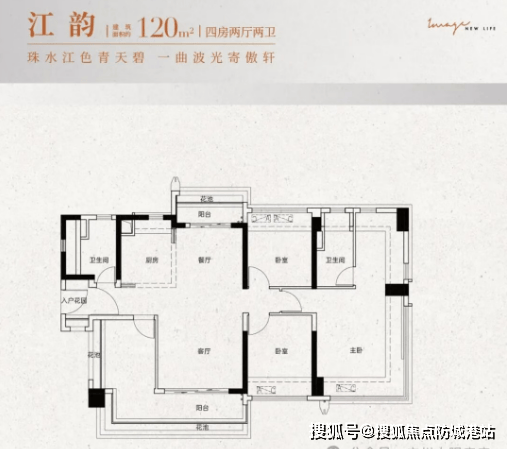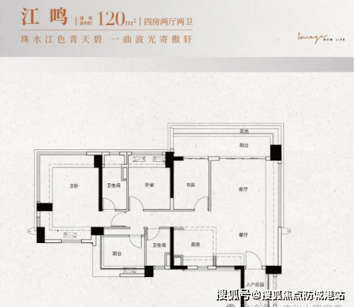 建面约120㎡四房两厅两卫:四开间朝南,南北双阳台设计,主卧带270°飘窗。