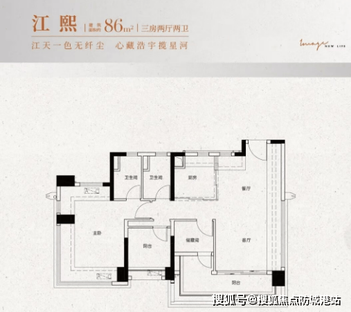 建面约86㎡三房两厅两卫:南向观景大阳台,全屋动静分离设计,主卧带270°飘窗。
