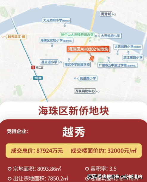 越秀珠实·皓悦滨江是由越秀地产与珠江实业联合开发的一个高端住宅项目,位于广州市海珠区滨江中板块。该项目占地面积约8000平方米,总建筑面积约为4.1万平方米,规划有两栋住宅楼,共计约300套房源。项目于2025年1月底由越秀地产以总价8.79亿元竞得,折合每平方米地价3.2万元,成为当年广州土拍的第一拍。