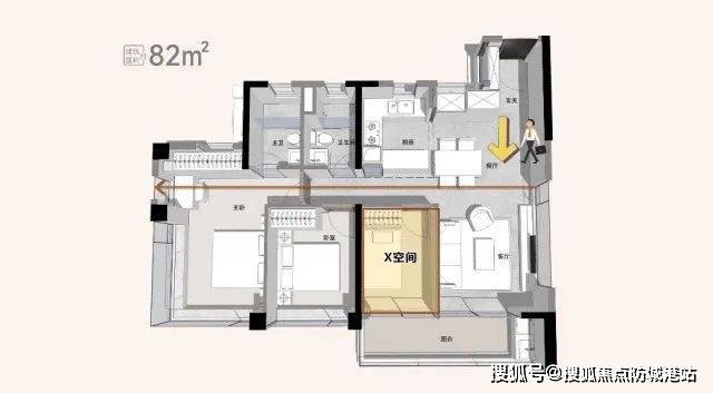82㎡三房两厅两卫:所有卧室均朝南,客厅和卧室位于南侧,双卫生间、厨房位于北侧,实现了良好的通风和采光效果。