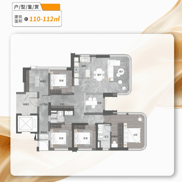 【映序|建面约108-111㎡ 五空间两厅两卫】:改善主力户型,全南向布局,双U型全景舱设计,得房率约150%,空间阔朗大气,适配四口之家或改善型家庭。