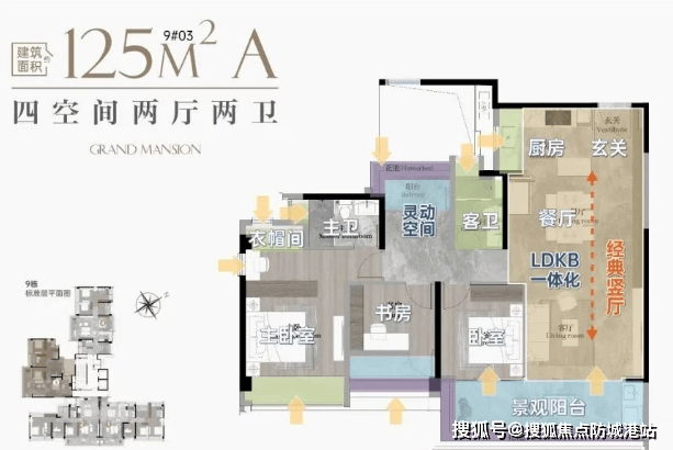 约125㎡B户型:4.5开间朝南,全明通透,采光极佳;