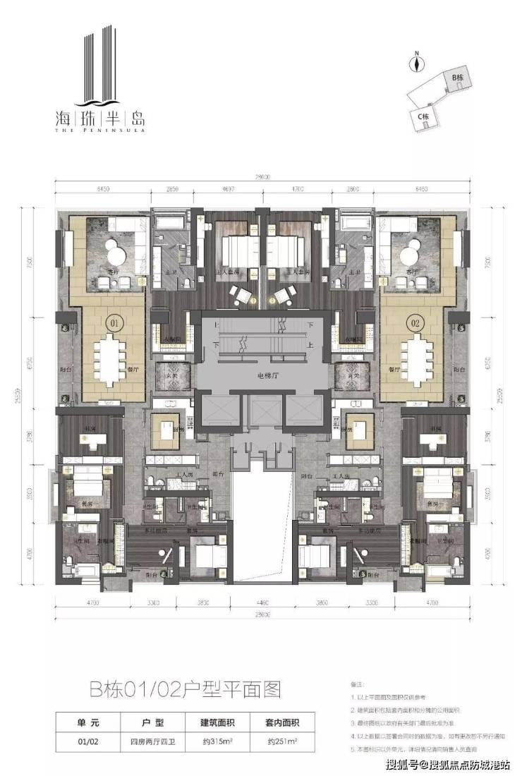 海珠半岛花园目前在售的户型面积在290㎡至315㎡之间,主要为四房两厅四卫的设计。每个户型都带有豪华装修,层高达到3.4米,空间宽敞、通透,确保了居住的舒适性和实用性。尤其是对于那些追求高品质生活的家庭或高端客户群体来说,这里的每一套房子都是理想的选择。