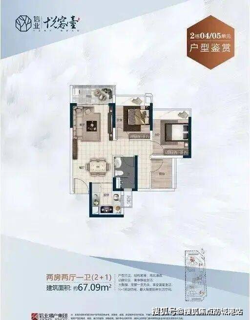 67.09㎡两房(2 + 1)两厅一卫北向户型: