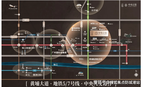 双地铁加持:项目距离地铁 5 号线与 7 号线交汇的大沙东站约 800 米,步行 10-12 分钟可达。搭乘 5 号线,3 站直达天河金融城,10 站(约 26 分钟)无需换乘直达珠江新城;搭乘 7 号线,3 站到黄埔科学城,7 站到番禺万博,30 分钟内畅达珠江新城 CBD、琶洲 CBD、万博 CBD、科学城 CBD 四大核心商务区,跨区通勤效率极高。