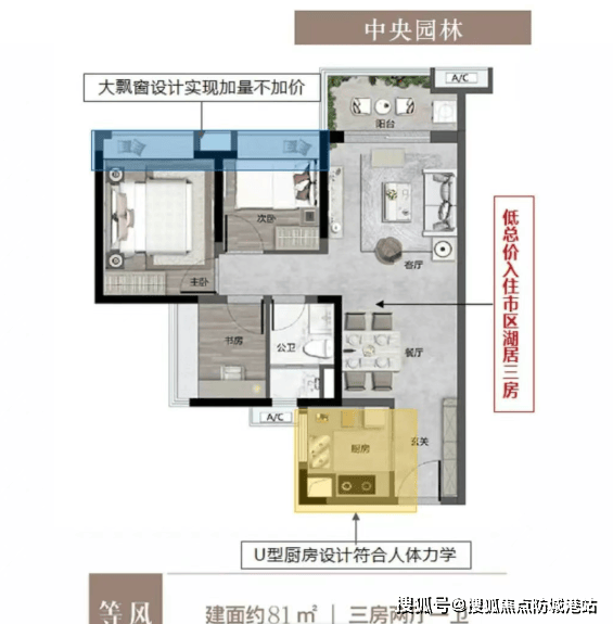 92㎡三房两厅两卫:全南朝向采光,卧室全带飘窗,空间开阔,加量不加价;