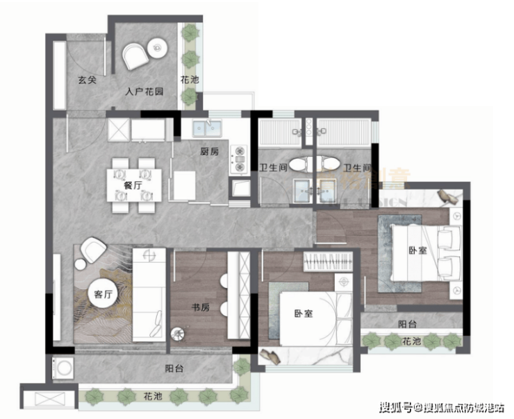 约89㎡ 3+1房2厅2卫:四开间九面采光,全明通透户型,LDKG一体化客餐厨设计,客厅和次卧空间可灵活组合,配备约5.6米双面宽阳台,主卧独立套房设计。
