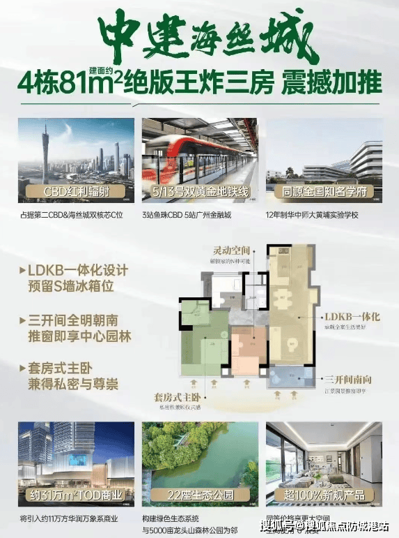 中建海丝城是由中建八局和知识城集团联合开发的大型综合项目,位于广州海丝城板块。该项目占地面积214,900平方米,建筑面积达到823,200平方米,规划为7个组团,首推【阅山组团】。项目集地标办公、购物中心、品质公寓于一体,打造了约31万平方米的TOD商业综合体,并引入了华润万象系商业,成为黄埔区的新地标。