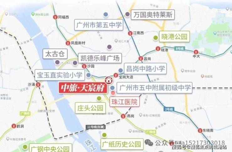 广州中旅天宸府精准定位**城央精奢大宅**,雄踞海珠西昌岗中路与宝岗大道十字交汇处,坐拥宝岗大道、工业大道、江南大道三大城市黄金走廊围合加持,地处海珠多年无新增宅地的珍稀核心板块,土地资源稀缺不可复制,板块发展底蕴深厚、生活肌理成熟,是老广认可度极高的宜居生活主场。区别于外围新区需要长期等待配套落地,项目立足主城成熟生活区,数十年沉淀的烟火氛围、完善生活配套、浓厚居住氛围与生俱来,无需规划等待,入住即享一站式醇熟生活。