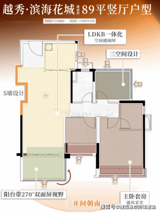 建面89㎡的户型,是项目的热门户型之一,该户型做了三个270°视野(景观阳台、主卧和次卧),并且还是三空间带主套,在同面积段户型中极具竞争力。户型采用无S墙+LDKB设计,空间通透,动线合理,主卧单面采光,确保了主卧的私密性与舒适度,整体功能和通透性对比同类型户型高下立现,非常适合新婚家庭或三口之家居住,既能满足日常居住需求,又能享受高品质的居住体验。