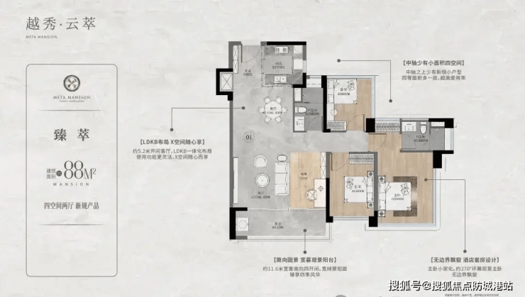 项目主打 88㎡四房、106㎡四房、117㎡四房 / 五房三大主力户型,户型设计方正,南北通透,户户朝南,采光通风效果极佳;所有户型均采用双阳台设计,观景阳台连接客厅,生活阳台连接厨房,实现观景与实用的完美结合;主卧采用套房设计,配备独立卫生间、衣帽间,提升居住舒适度;户型得房率超 85%,远高于城芯同类项目,空间利用率极高。