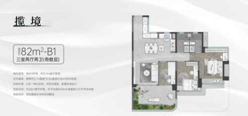 82㎡户型:奇数层户型为竖厅格局,客厅可以与次卧打通成为超大方厅,南向面宽达12.4米,空中花园面积为20㎡;偶数层户型的空中花园面积更大,达到24㎡。
