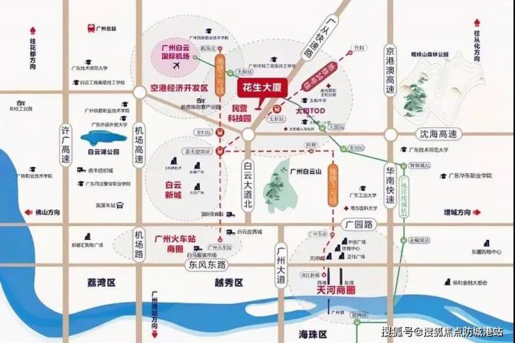 花生大厦项目位于北太路与广从三路交汇,从大的版块来讲项目所处的是国家重点规划太和镇TOD民营科技创新板块,西接空港经济区、江高创新制造、东联和龙创新板块,南进白云新城,与太和镇TOD交通枢纽连片形成航空、物流、创新制造、科技研发产业、先进交通导流的大产业格局,广州产业,唯白云独尊。