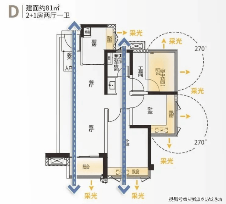81 ㎡户型,经典竖厅三房,阔绰的入户玄关,可定制大鞋柜,U型厨房布局,缔造更多烹饪惊喜;约3.4米餐客厅开间,直通南向阳台,空间更通透。双次卧均配备270°转角窗户,三面采光,难能可贵。