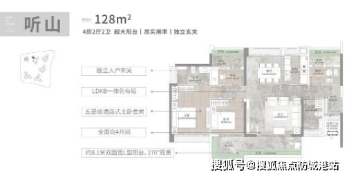 140㎡ 4+1房:南向采光面达15.7米,南北双阳台,主卧配270°折叠屏飘窗;