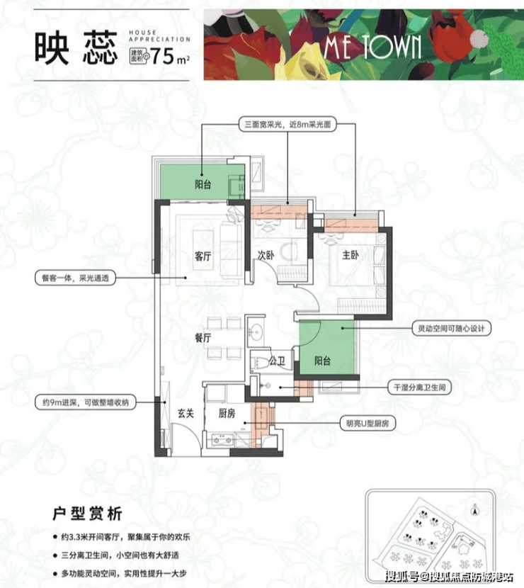 75平方米三房两厅一卫:传统竖厅设计,客厅、主卧、次卧三开间朝北,三分离卫生间,最大限度解决业主起居便利问题。