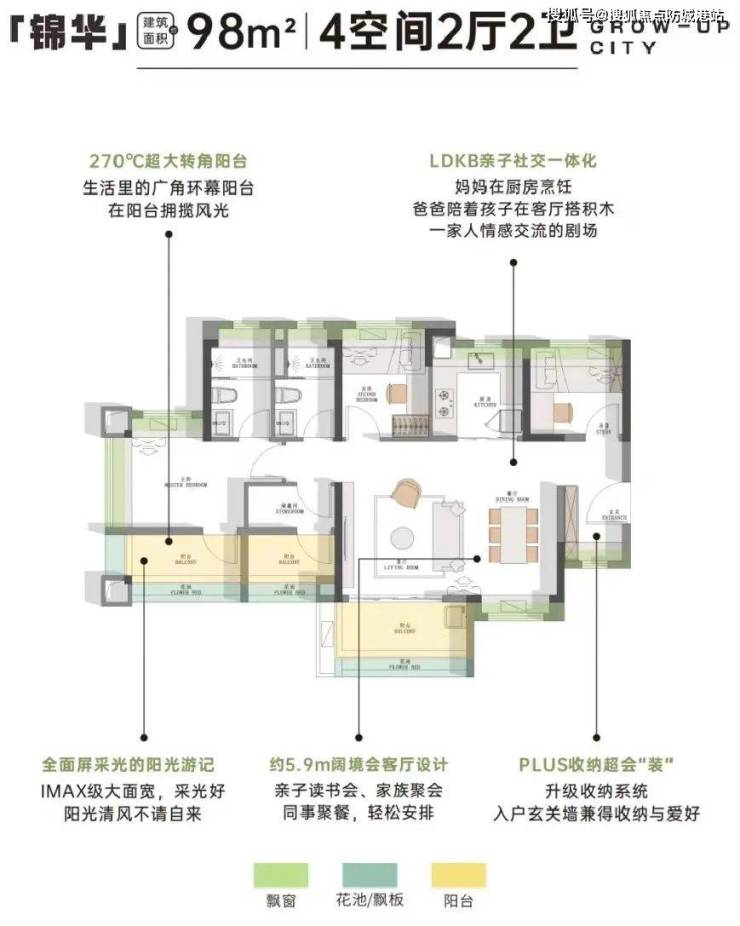98㎡四房2厅2卫:南北对流 主卧270°转角阳台