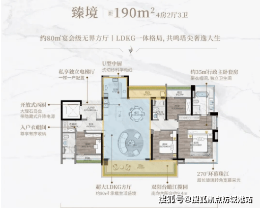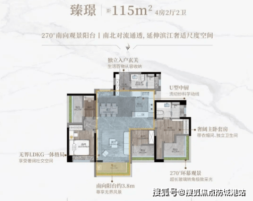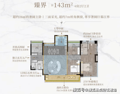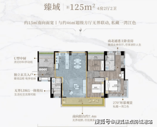 项目目前在售的户型包括115㎡、125㎡、143㎡和190㎡四种全四房产品,所有户型均采用方正格局设计,得房率接近100%,并配备了国际品牌的装修标准。特别是主卧采用了270°环幕观景设计,提升了居住品质。