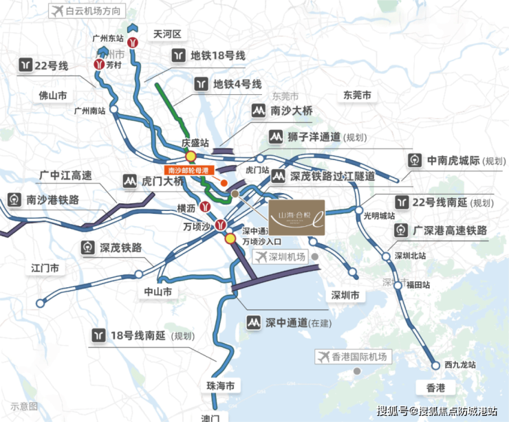 山海·合悦坐落于南沙湾核心地段,毗邻南沙邮轮母港和南沙游艇会,享有得天独厚的海洋资源和高端配套。交通网络四通八达,高速公路距离项目约1.5公里,快速接驳莞佛高速,驱车数分钟即可通达东莞及深圳。地铁交通极为便捷,紧邻地铁4号线、15号线(规划中)和22号线三大地铁交汇的南沙客运港站,步行仅需约900米。地铁22号线与深圳地铁实现无缝连接,湾区核心城市30分钟内可达,构建高效生活圈。项目靠近广州唯一连接港澳的客运港,轮渡仅需一小时直达香港,连接五大国际机场,形成多维度海陆空立体交通网络,极大提升湾区出行便利。