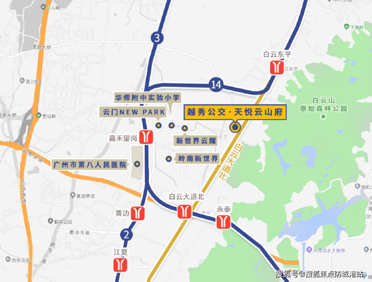 越秀公交·天悦云山府地处白云大道北87号,距离白云新城不到2公里,紧邻地铁14号线东平站(1.7公里)和嘉禾望岗站(2公里)。此外,项目还创新性地引入了首个全新的公交TOD模式,通过抬高设计将公交车站场设于架空层,实现了“下楼即上车”的无缝对接,大大提升了居民的出行便利性。同时,项目周边还有多条高速公路,驾车出行也十分便捷。