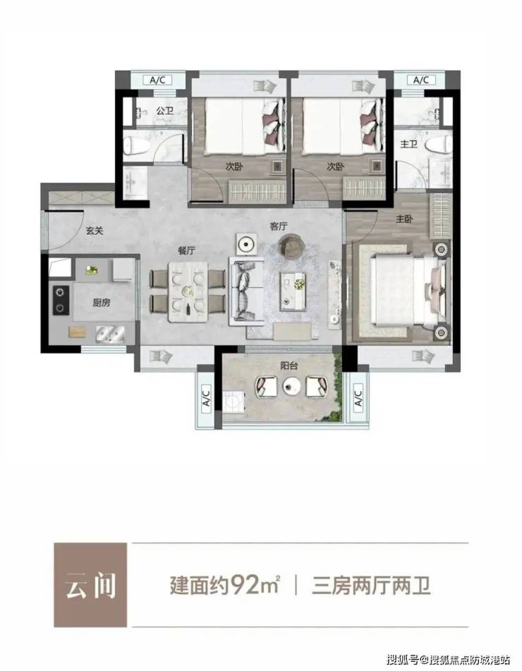 九十二平方米的三房两卫户型是三口之家的热门选择。该户型做到了全南采光,三个卧室均带有飘窗,不仅增加了室内使用面积,还提供了极佳的观景视野。