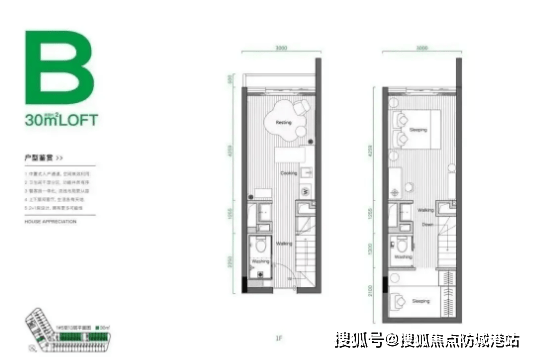 30㎡ LOFT户型(双客厅布局):采用上下双客厅设计,实现动静分区,一层为公共活动区域,餐客厨一体化布局,动线合理,适合家庭聚会;二层为休息区域,规划2+1房设计(主卧+次卧+多功能房),可满足小家庭过渡性居住需求,也可改造为办公+居住的复合空间。户型配备大尺寸落地窗,采光通风俱佳,空间感十足。