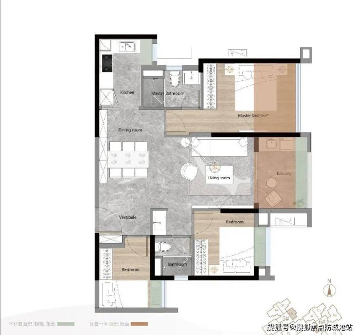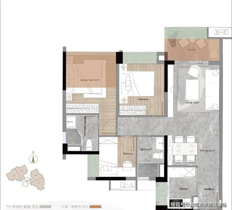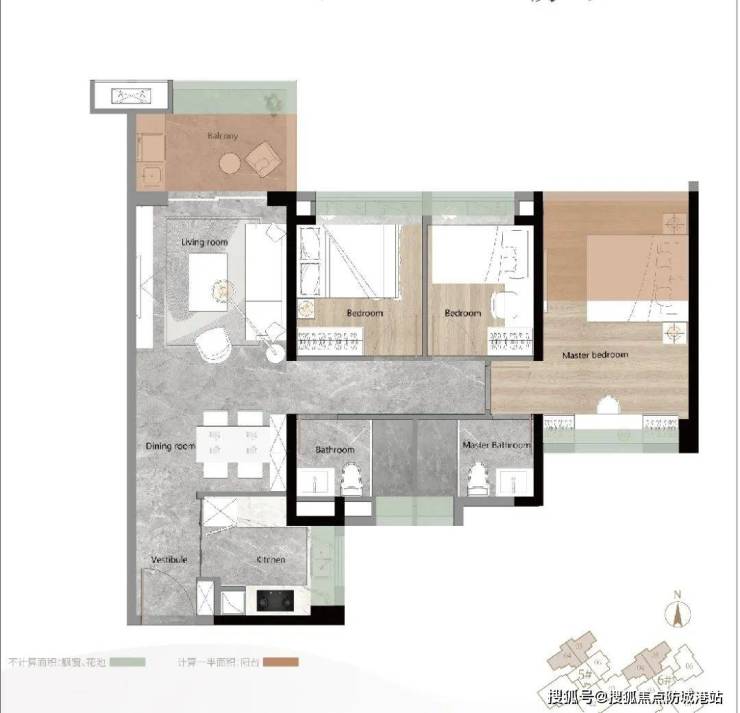 A户型属于经典竖厅格局,三个房间都和阳台同为西北朝向,两个次卧都带飘窗,阳台外还有花池,都不计算面积。主套房为“+1”房,比较少见,但目测赠送面积不少。B户型则是相对更常规的格局,也是竖厅+动静分区,有西北、东北两种朝向,其中东北向望山单位预计价格会相对高一点。C户型格局比较特殊,客餐厅+阳台设置在中间,卧室分布在两侧,有那么一丢丢岭南传统建筑“三间两廊”的影子。