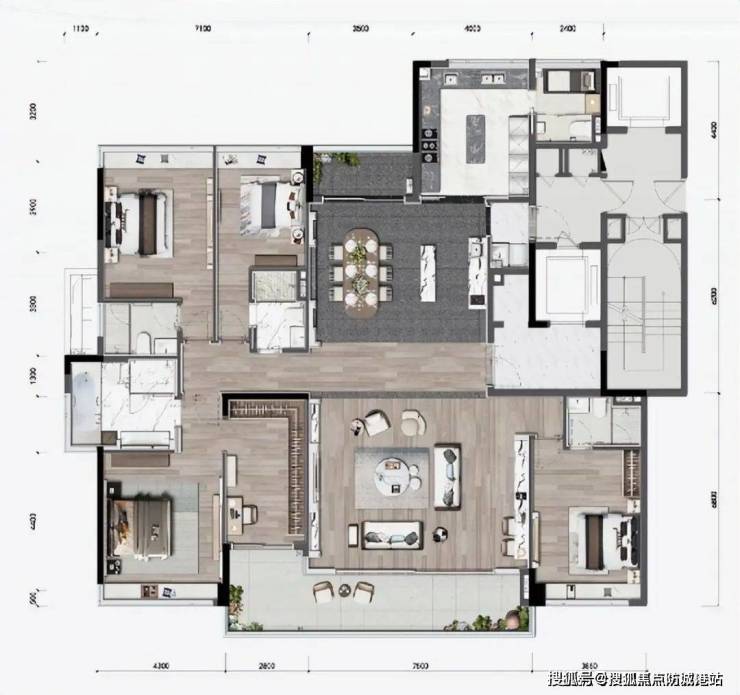 场景适配:适合三到四口之家或商务人士,主卧办公区可满足居家办公需求,大客厅与开放式餐厅适合家庭聚会或商务宴请。