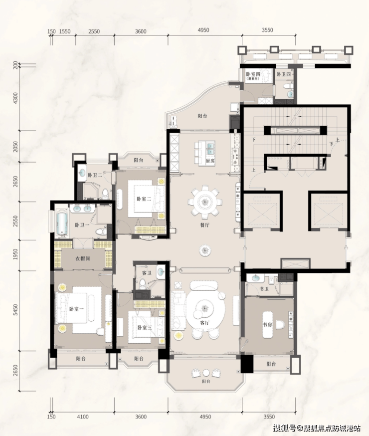 • 286㎡四房:全明格局,主卧270°江景飘窗,独立衣帽间与双台盆卫浴;