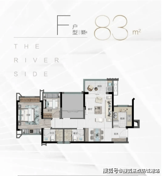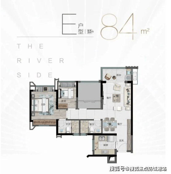 84㎡三房户型:相较于83㎡户型,该户型空间更为开阔,整体布局方正通透,全南向采光无死角。客厅与餐厅相连,形成一体化公共空间,提升活动区域舒适度,适合家庭聚会、日常休闲;阳台宽度升级,不仅能满足晾晒需求,还可打造为休闲小花园、茶室等,丰富生活场景。主卧配备独立卫生间,保障业主私密性,次卧与儿童房空间适中,可根据家庭需求灵活改造,厨房与卫生间通风良好,有效避免潮湿异味问题。