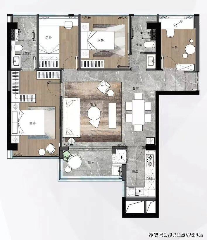 可以看到大户型景观很不错,只是客餐厅的空间确实不够实用,依然会有过道浪费面积。餐厅面积较小,四房双主套而不是五房的设计,更适合非大家庭的业主居住。