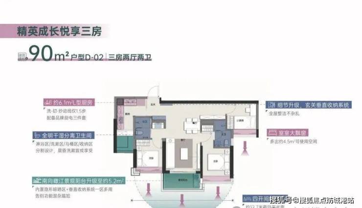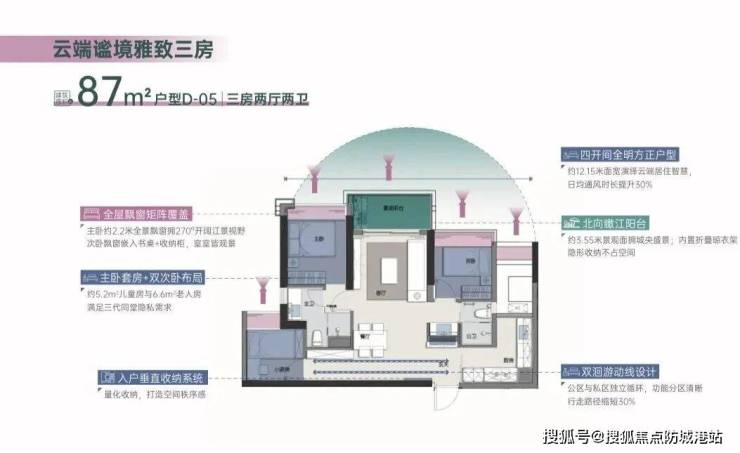 主力在售的是D栋新加推的87、90和107平方米三房,三梯六户设计。以87平方米户型为例,做到了三房两卫,主卧带飘窗,厨房U型布局,阳台连通客厅,得房率在同类产品中表现不错。B、C栋尾货则以128至144平方米大户型为主,适合改善家庭。所有楼栋层高44层,视野开阔,部分高区单位能望到珠江或太古仓江景。