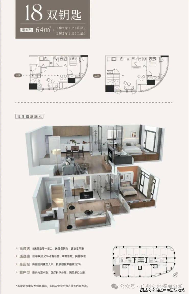 约64㎡,可设计为2+1房2厅2卫(中空设计3+1房2厅2卫(双层设计)。