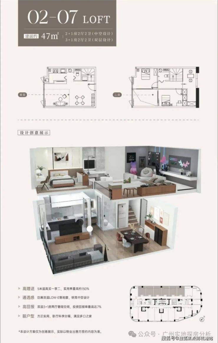 公寓产品方面,项目推出46-57-63-85平5米层高loft公寓,南向独立阳台,通燃气可明火,打破了传统公寓不通燃气的局限,提升了公寓的实用性与居住舒适度。5米层高的设计,让公寓可以灵活改造为双层空间,实现“买一层得两层”的超高性价比。其中,约47㎡的公寓,可设计为2+1房2厅2卫,中空设计可打造3+1房2厅2卫(双层设计),或者复式双钥匙户型,既可以满足自住需求,也可以用于出租,实现双重收益;约64㎡的公寓,可设计为2+1房2厅2卫,中空设计可打造3+1房2厅2卫(双层设计),空间开阔,布局合理,适合单身贵族或小两口居住。