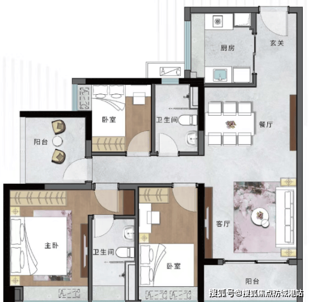 98㎡三房两厅两卫:多功能空间设计,卧室全飘窗设计,居住舒适度高。