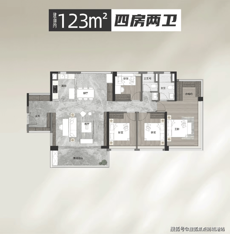 建面约123㎡四房:户型空间宽敞,每个卧室都可放下1.8米大床,居住体验相当于144㎡大宅。品质感十足,适合追求舒适居住体验的刚改家庭,能够为家人提供充足的活动空间。