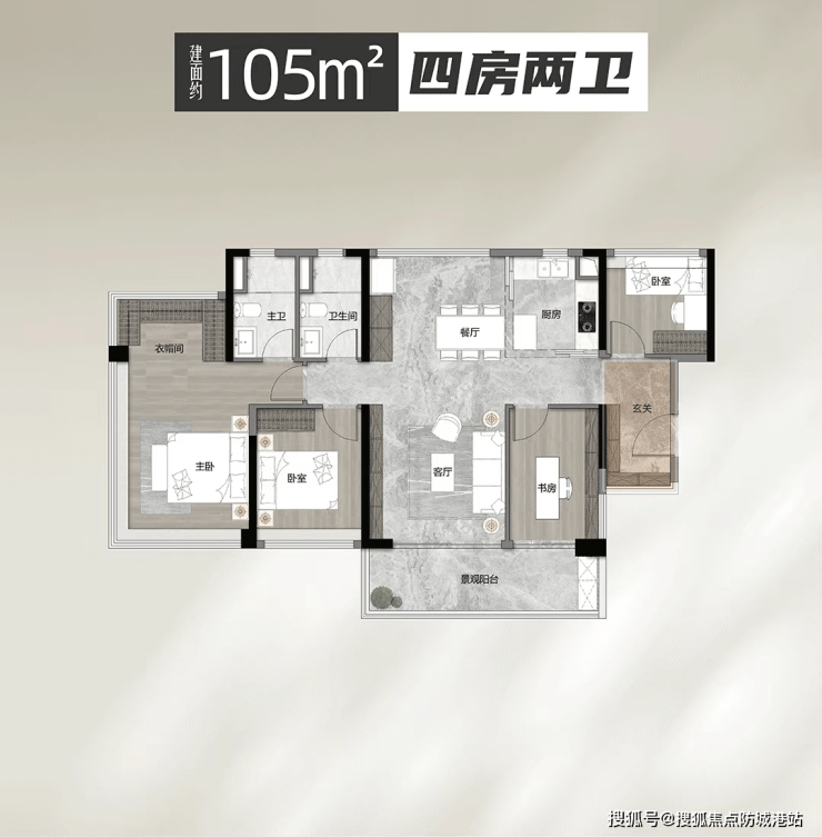 建面约105㎡四房:采用单边户设计,实现南北通透,通风采光效果极佳。105㎡做到四房设计,能够满足三代同堂家庭的居住需求,一步到位解决居住问题,无需后期换房折腾。