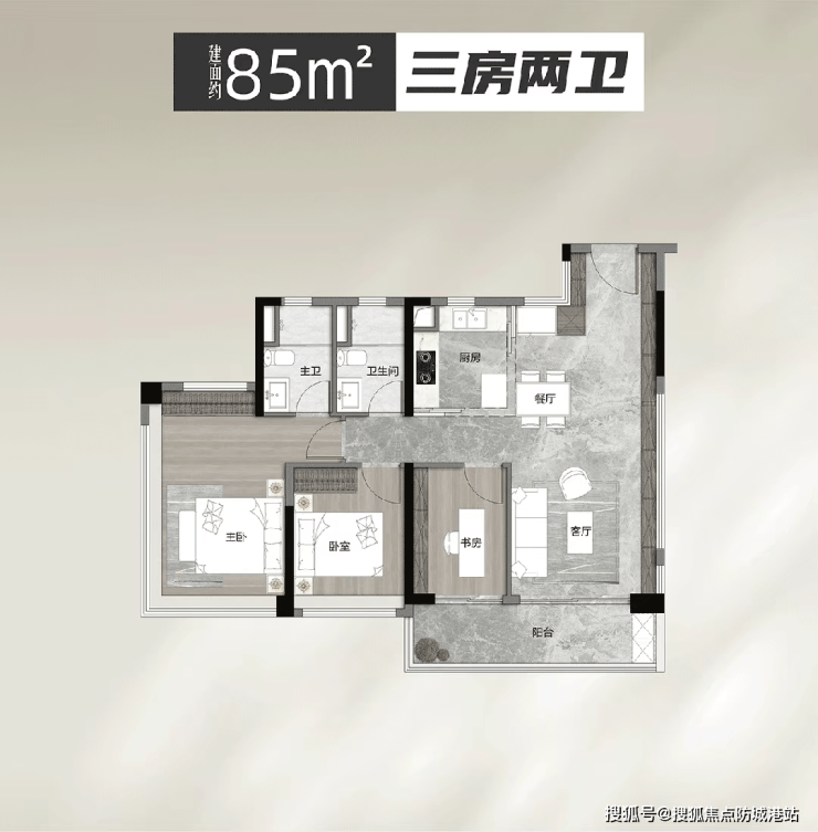 建面约85㎡三房两卫:该户型带6米大阳台,空间拓展性强,超越市场同类产品。三房两卫的设计能够满足三口之家的居住需求,6米大阳台不仅提供了充足的晾晒空间,还可打造为休闲观景区域,提升生活品质。