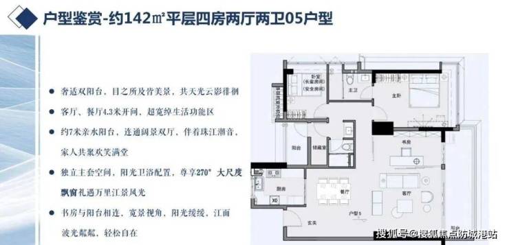 保利阅江台位于广州大道西侧,紧邻滨江东路,是海珠区滨江东板块的核心位置。项目包含两种户型配置:5-18层为2梯5户设计,面积从120至143平方米;20-30层为2梯2户设计,提供220平方米的大平层户型。