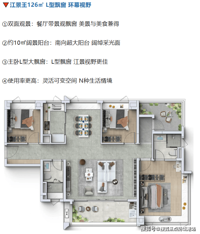 127㎡户型在126㎡的基础上进一步优化,南向采光面延伸至约15.1米。高配交标下,标配中央空调成为标配。IMAX级的观景视野,配合灵动百变的设计空间,能够满足N种生活情境的需求。主卧L型大飘窗的双面观景设计,再次强化了空间的通透感与景观价值。