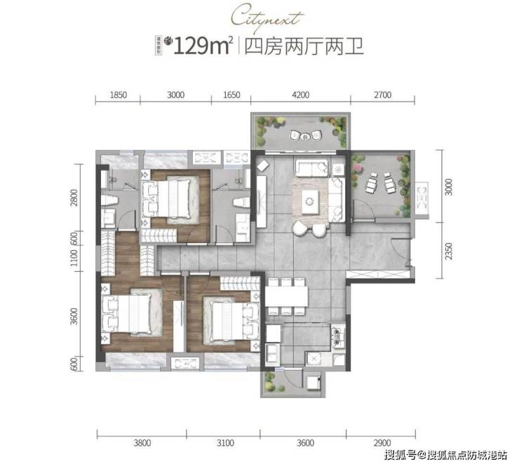129㎡四房:南北双阳台设计,超宽入户玄关,带来豪宅般的阔绰感与尊贵感。
