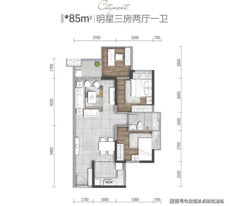 85㎡三房两卫:适合年轻家庭或小家庭过渡,零过道设计减少空间浪费。