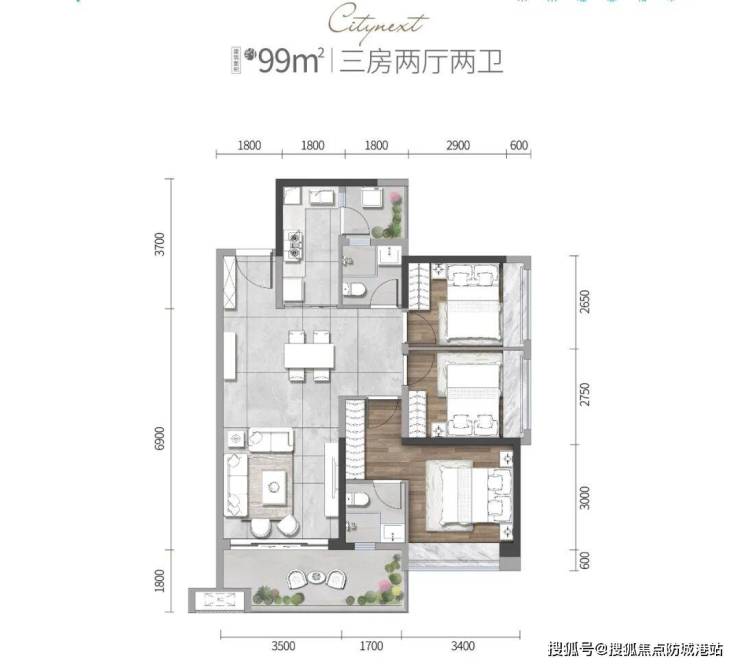 99㎡竖厅设计三房:厨房连通生活小阳台,南向阳台尺度更大,适合追求生活品质的家庭。