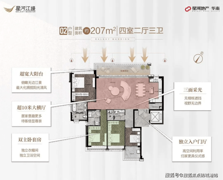 此外,星河江缦所在位置享有三江交汇的独特地理优势,距离珠江最近的地方仅90米,拥有长达700米的长江岸线,并在江边打造了约1.8万平方米的滨江公园,营造出“聚宝盆”般的风水格局。