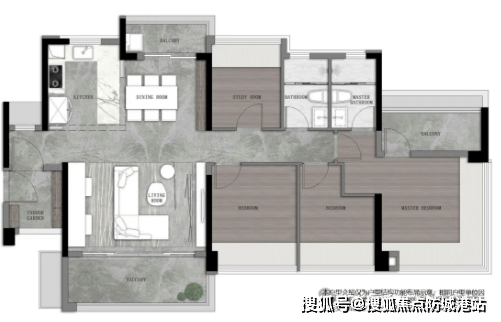103㎡四房两卫:三代同堂换房必看,五开间约14m采光,270℃无立柱转角阳台,阳光梳妆台及衣帽间。