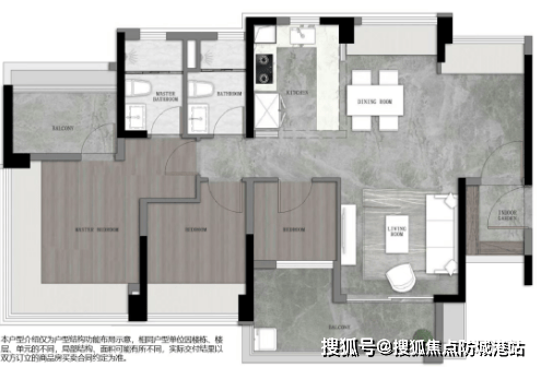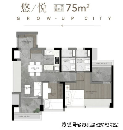 75㎡三房两卫:四开间朝南,全明转角玄关,开放式厨房,南北对流主套及衣帽间。