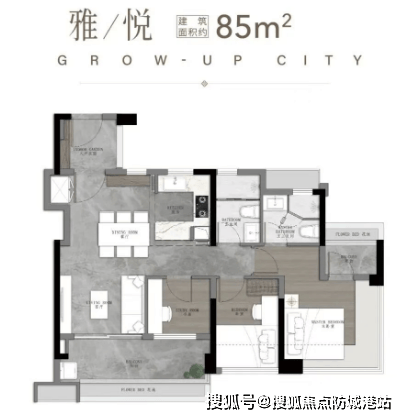 86㎡三房两卫:三口之家一步到位的选择,五开间约11.1m采光,5.4m跑道式阳台,主卧270°无立柱景观飘窗。